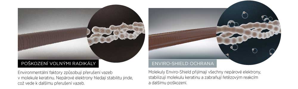 Enviro-Shield je ochranný systém vašich vlasů. Váže se s jakýmikoliv nepárovými elektrony, které jsou škodlivé a zastavuje jejich řetězovou reakci. Tím se zabrání dalšímu poškození a zajistí, že vlasy zůstanou silné, živé, hladké a odolné – každý den.
